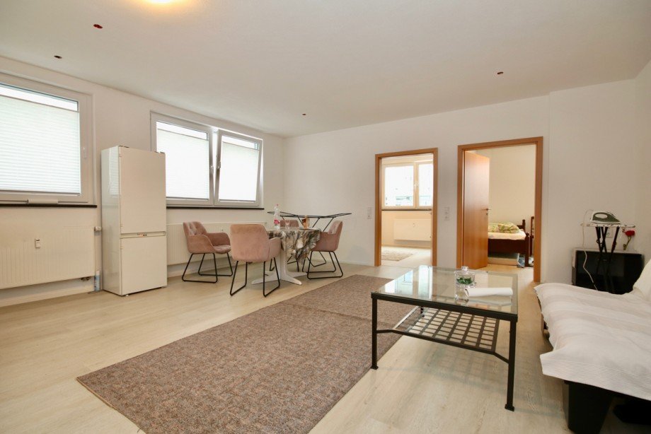 Über eine Garderobe eröffnet sich der Wohn- und Essbereich mit knapp ca. 33 m². Linker Hand im Eingangsbereich das Bad, rechts das WC.
